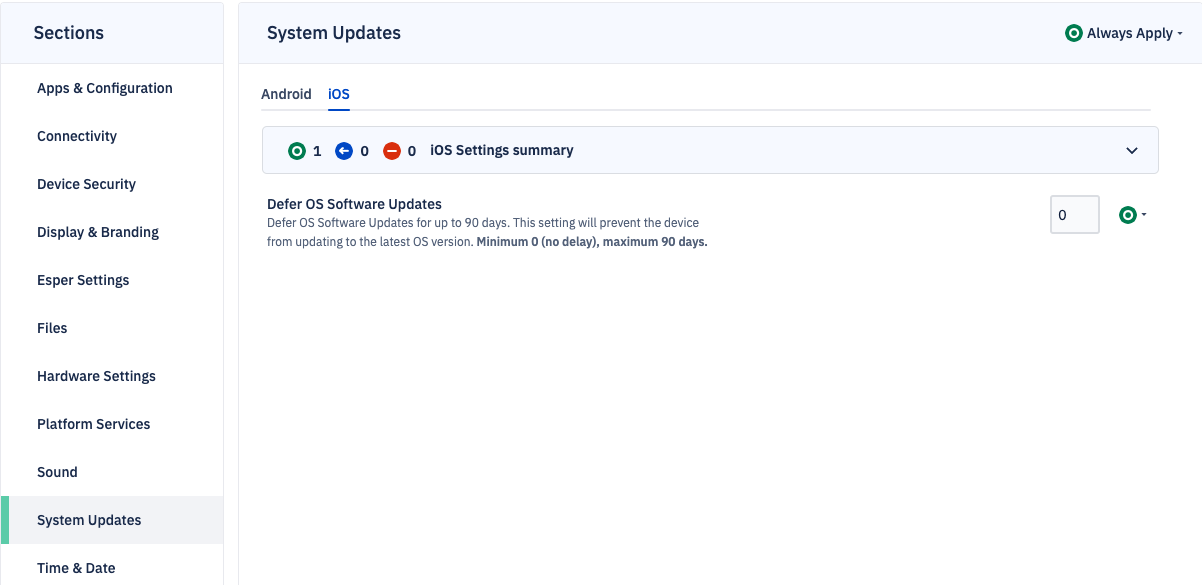 - You can now defer OS updates for iOS devices through a blueprint. Updates can be deferred for up to 90 days from the software release date. For example, if a software update came out 30 days ago, users would prompted to update after 60 days (even if setting the defer value to 90). Use defer software updates to avoid user disruptions.