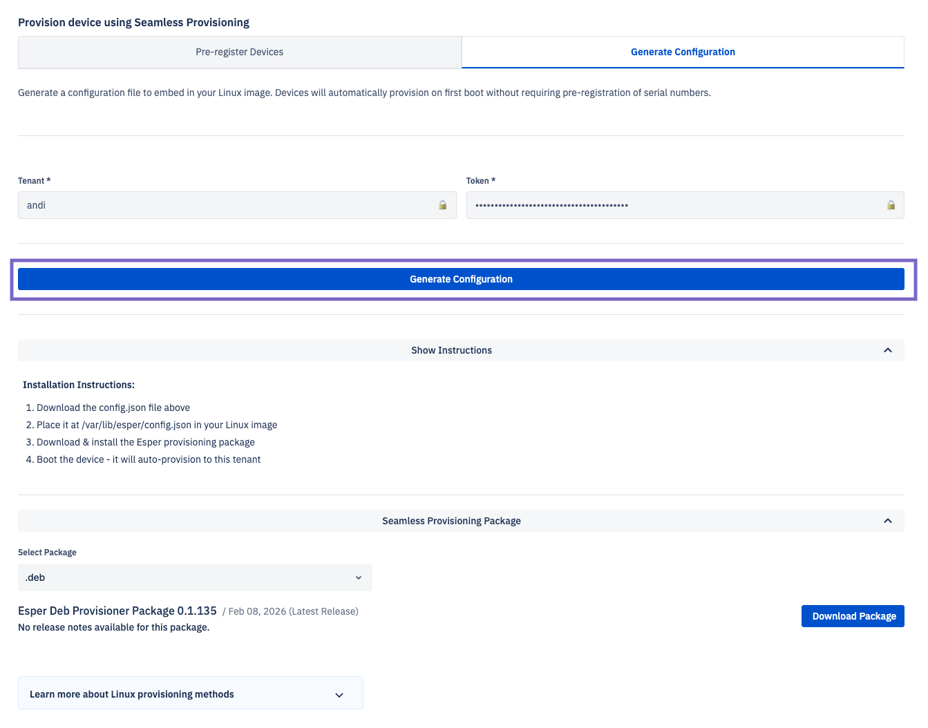 With Linux Seamless Provisioning, you can either pre-register devices using known serial numbers or generate a configuration file to include in your image. Once the customized image is installed and the device boots, provisioning occurs automatically—reducing manual setup steps and ensuring devices are provisioned on boot.