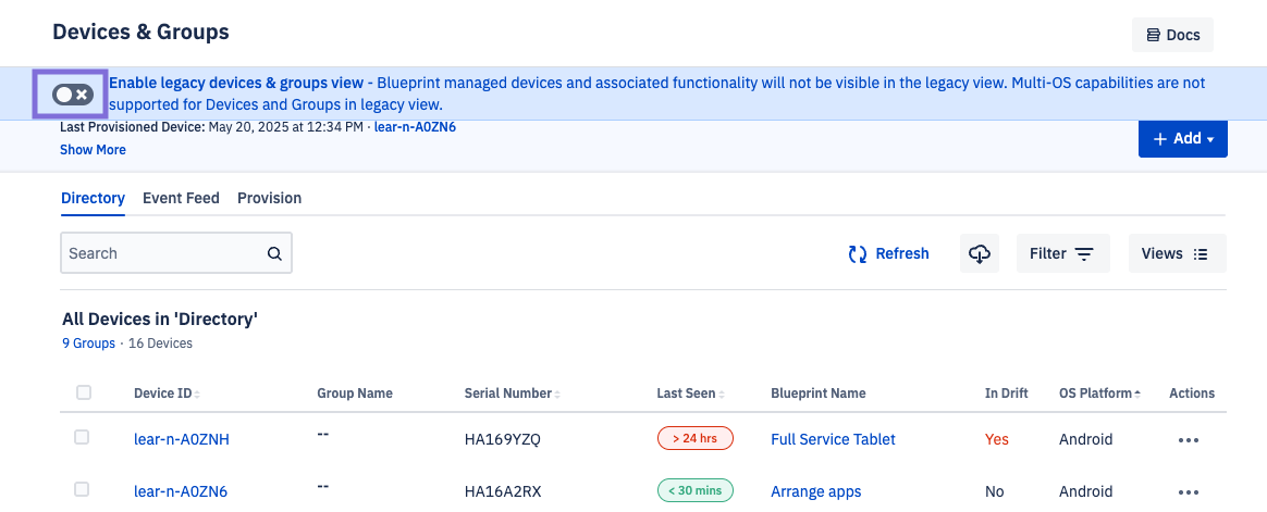 Use this setting to enable or disable the legacy Provisioning Templates experience. When this setting is enabled, users will be able to manage templates, compliance policies, and use the legacy Devices and Groups view.