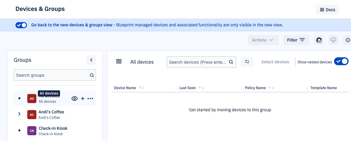 When enabled, a toggle appears in the Devices & Groups page and allows users to switch to the legacy Templates view.