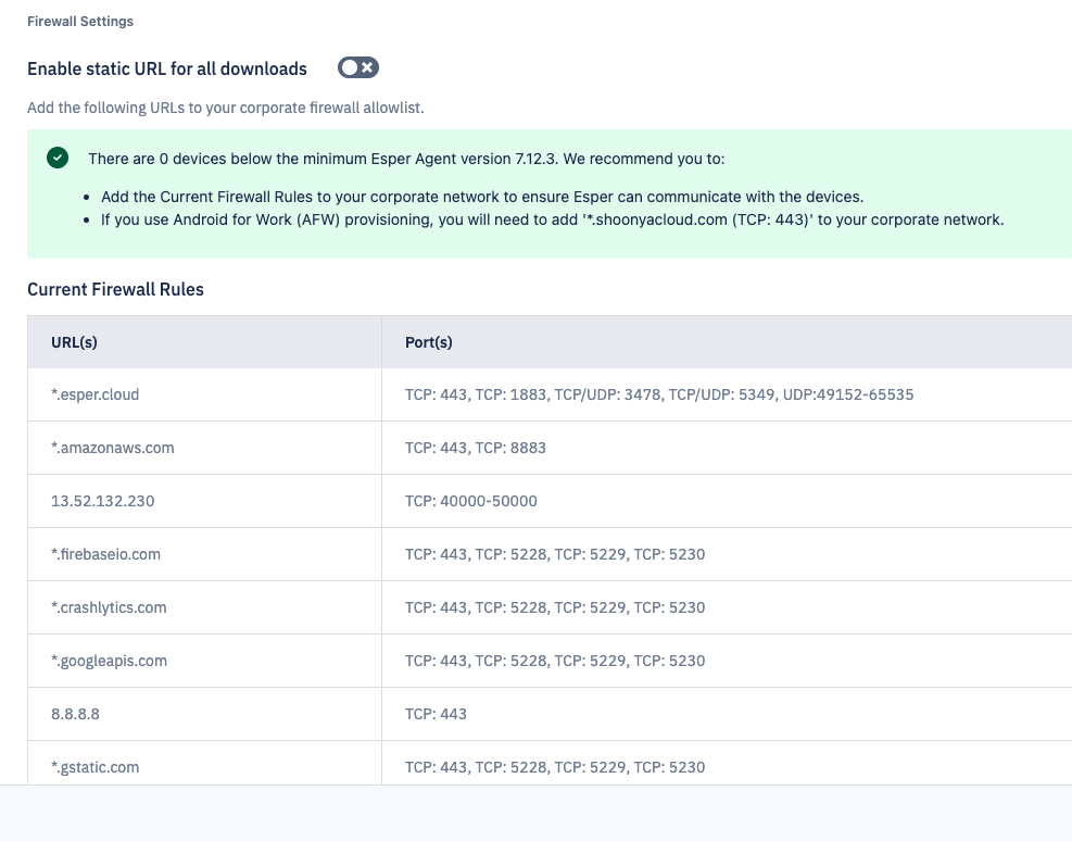 - View the required IP ranges and domains your network must allow to ensure Esper functionality.