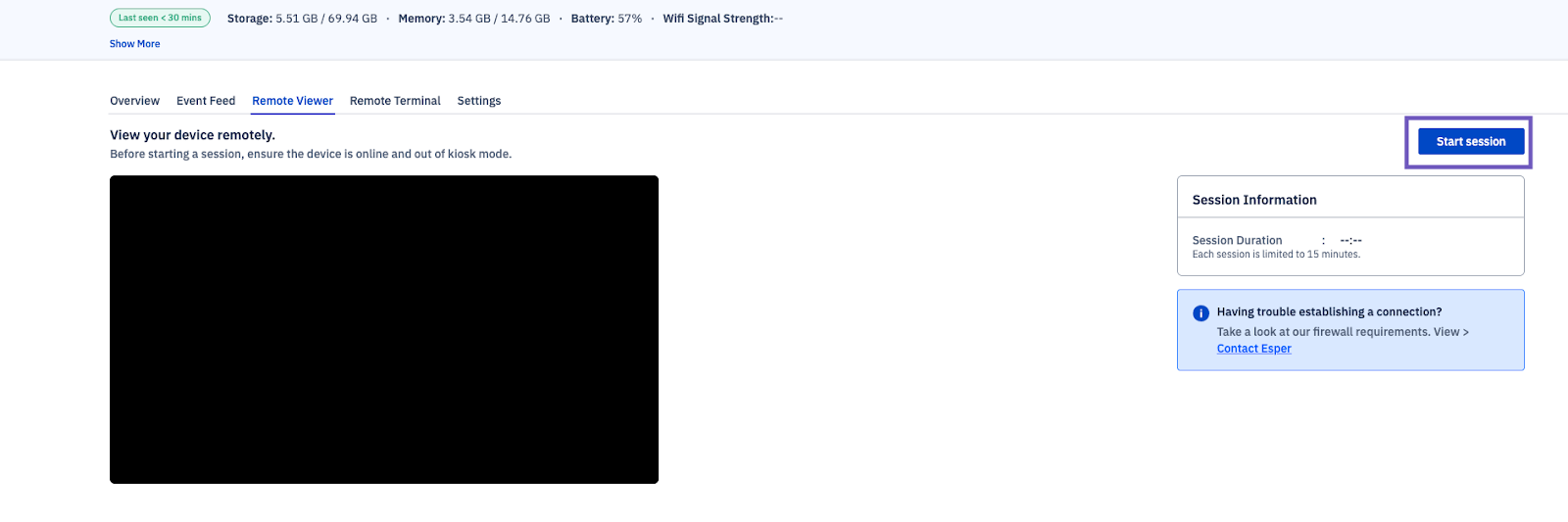 To start a session, make sure the device is on and connected to a reliable network (this is usually a device that was last seen 30 minutes ago or less). Then go to the Remote Viewer section of the device.