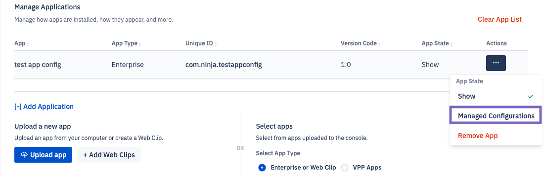 In Manage Applications, add a new application or identify an existing one that supports managed configurations. Then click on the ellipsis button next to the application and select Managed Configuration.