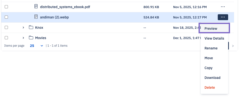 To preview a file, click on the ellipsis (...) button next to the file and select Preview. The file will open in a new tab. Max file preview size: 50 MB