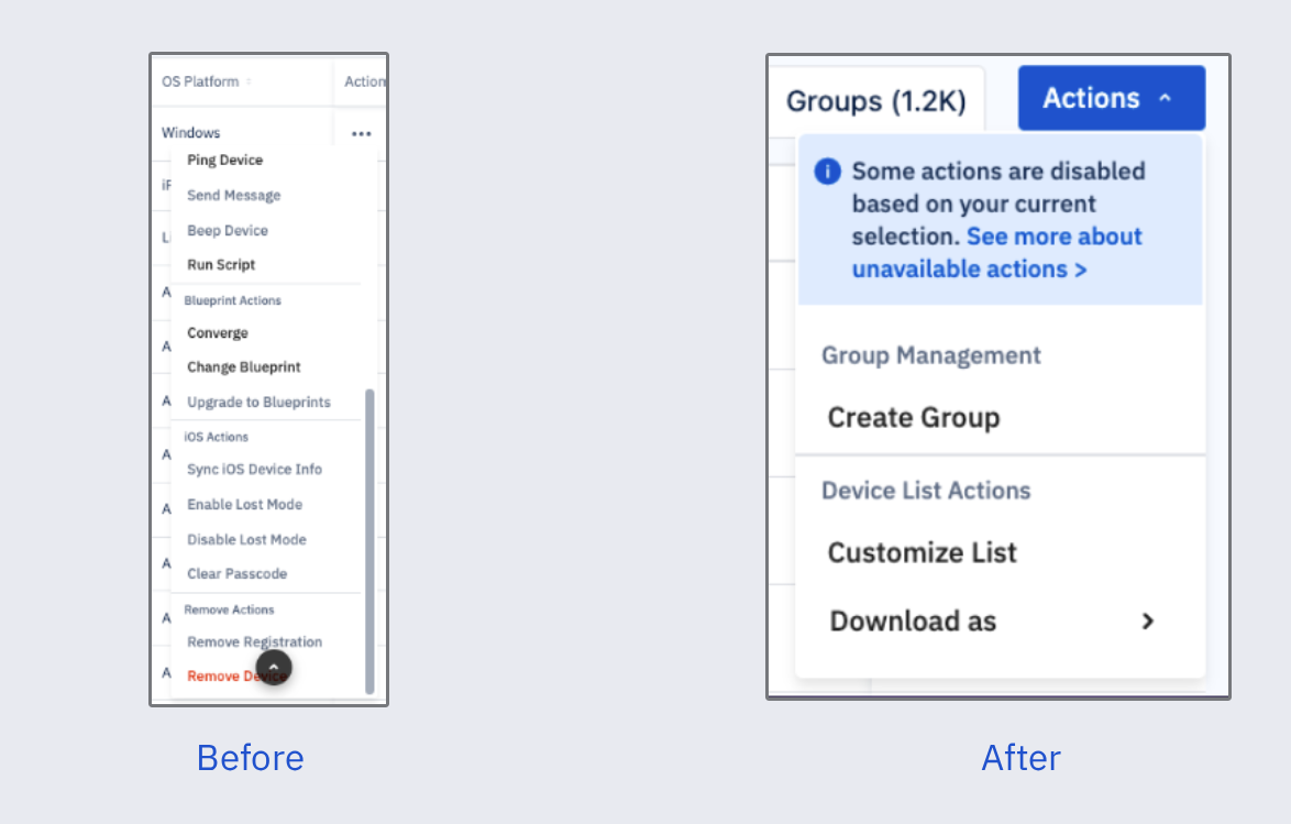 - Updated Actions Drop Down in Advanced View: Available and unavailable actions are now separated — see only what you can act on, with doc links for everything else. Now available in Devices & Groups.