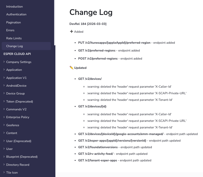 - New API Documentation Change Log: Keep up to date with the latest API changes with the new change log. Check for the latest improvements to enhance your workflows. The Esper API documentation is usually updated a few days after the DevRel release, so check back if you don’t see it right away. See the latest changes on the API documentation page.